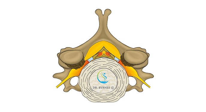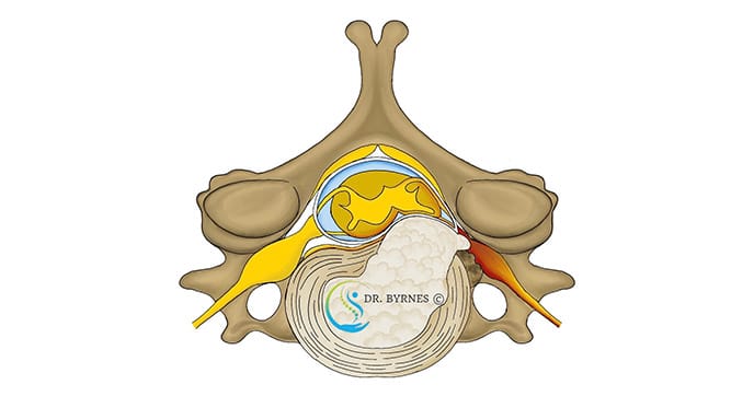 People can have symptoms if their nerves are irritated or pushed on by nearby bones or discs. Often, pain / numbness or weakness radiates down the arms, and sometimes, the legs are unsteady.